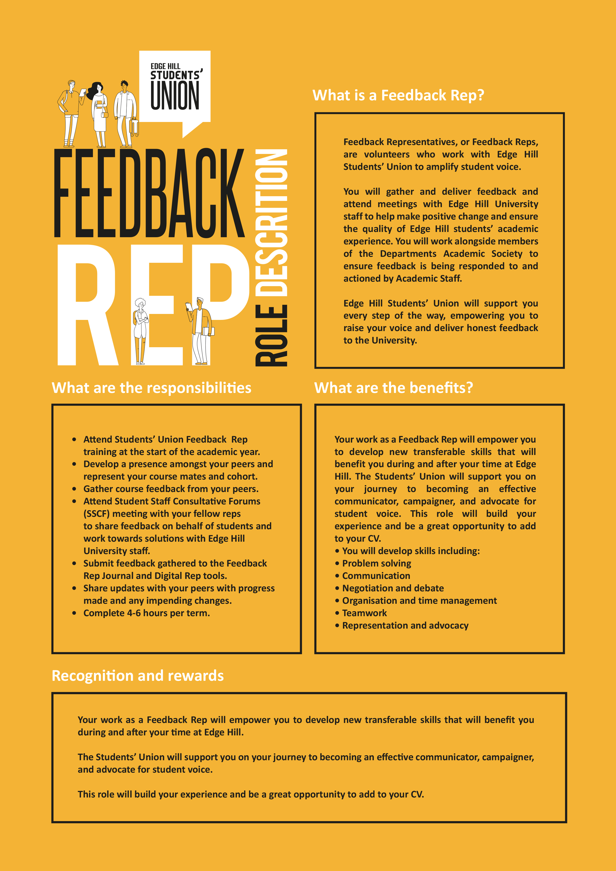 Feedback Reps receive training on gathering feedback from their peers and passing it on to their course leaders to see if any of the issues can be resolved.